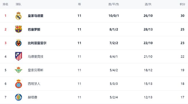 在积分榜,皇马依然排名榜首。皇马10胜1负拿到30个积分。阿隆索率队踢出了如此亮眼的成绩,让人佩服。巴萨拿下埃尔切之后,战绩变成8胜1平2负,总积分是25分,落后5分排名第2。第3的是比利亚雷亚尔,拿到23分。而马竞只拿到22分,排名第4。皇家贝蒂斯赢球之后,总积分达到19分,排名第5。第6的是西班牙人,拿到18分。